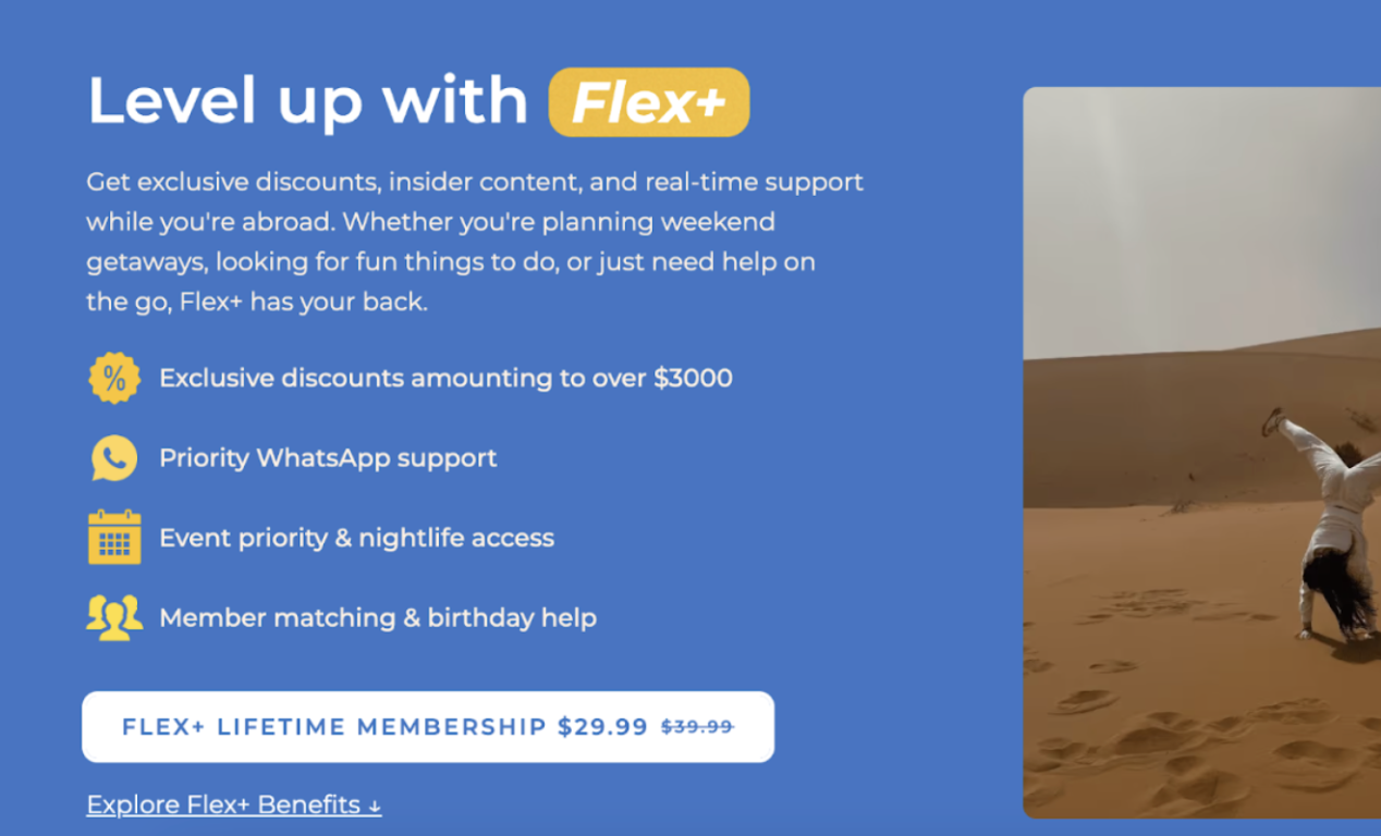 Flex+ is our premium subscription plan. With a subscription, you’ll get premium priority WhatsApp support, concierge chats with the Flextrip team (and even the CEO), exclusive discounts on trips and tours, and early access to major abroad events and nightlife.Right now, Flex+ is only $29.99 as part of our pre-abroad sale—don’t miss it.