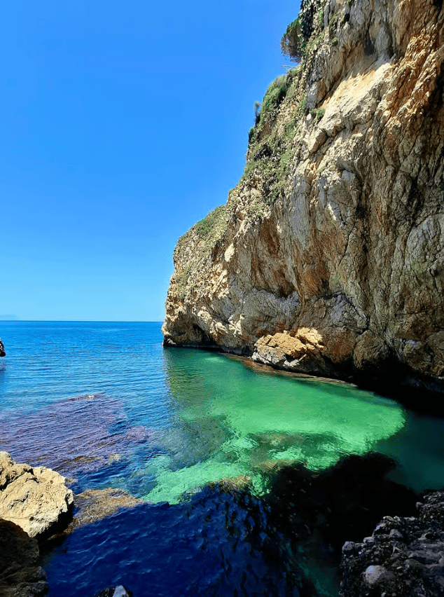 La Praiola Beach in Terrasini, Sicily is a picturesque sandy cove framed by volcanic cliffs and turquoise waters, offering a charming spot for swimming and sunbathing.